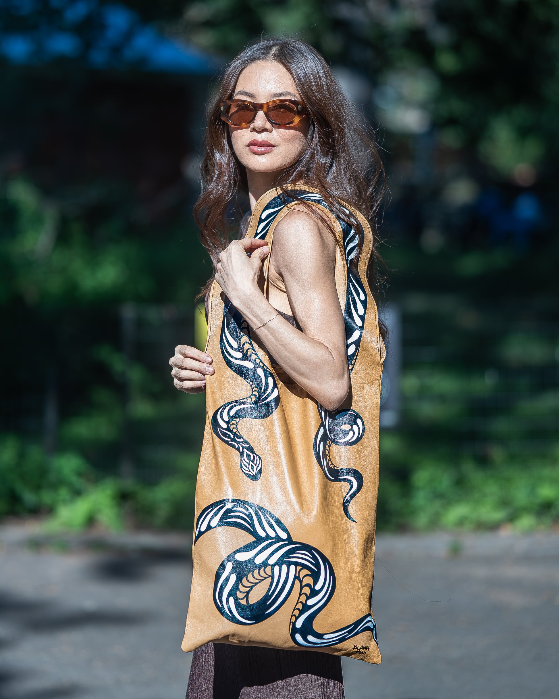 This limited artist collaboration features three one-of-a-kind deadstock leather bags hand-painted by New York–based multidisciplinary artist Alana Tsui. Known for her poetic linework and surrealist symbolism, Tsui’s work explores the female form, intuitive perception, and the space between the conscious and unconscious.